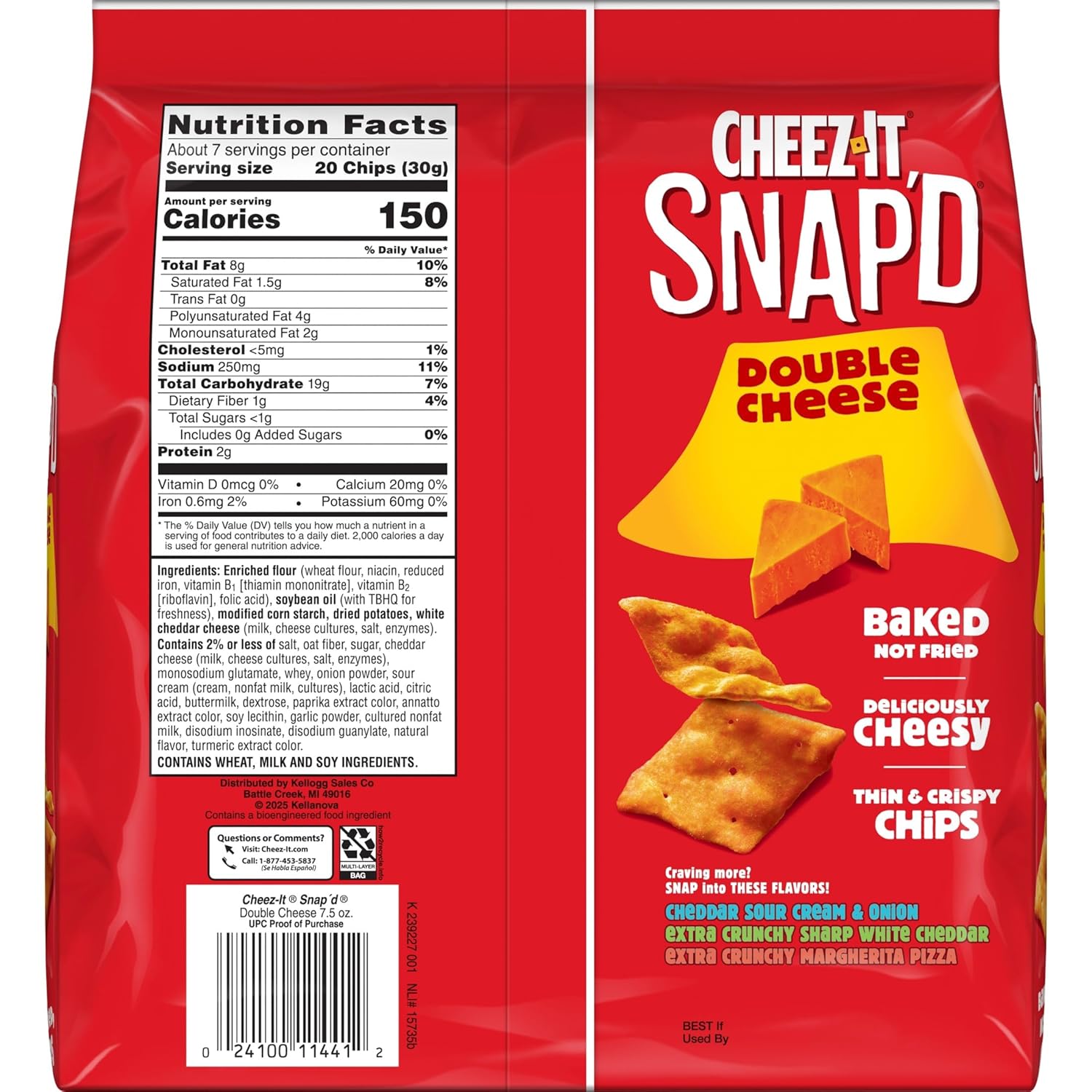 Make snack time more fun with Cheez-It Snap’d Double Cheese, the super thin and crispy cheesy baked snacks loaded with big cheese flavor. Includes 5, 12oz bags of irresistibly cheesy Snap'd snacks with 100% real cheese baked-in and sprinkled on top. The Snap'd snacks are delightfully thin with a crispy snap for extra crunch in every bite. Cheez-It Snap’d snacks are perfect for celebrating game time; they make a great addition to party spreads and cure late-night savory cravings. The cheesy options are endless. Pack your Snap’d snacks in school lunches or as an extra snack on-the-go. With double the cheesy zest for double the flavor and double the fun, this snack will tempt you with, ‘just one more bite.’ You'll love the bold crunch and delicious, tasty flavor of real cheese in every perfectly-baked bite of Cheez-It Snap’d Double Cheese Cheesy Baked Snacks.